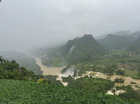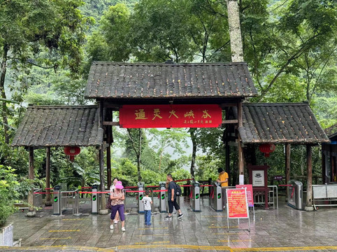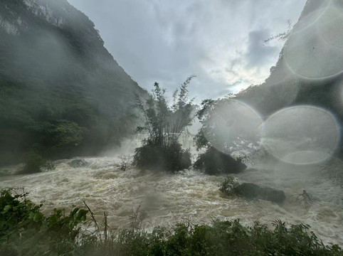 进入通灵大峡谷之前,我们路过了古龙山大峡谷,却发现由于这几天的大雨导致河流水位过高,古龙山大峡谷停止对外开放。幸好通灵大峡谷没有被淹,还正常营业。到达景区,售票员告诉我们尽管景区营业,但是通灵大瀑布后面原本可以参观的水帘洞景区,也因雨势过大而停止开放。