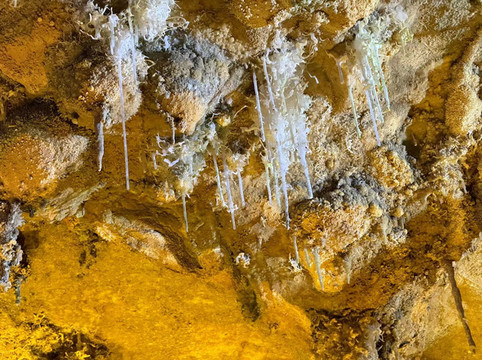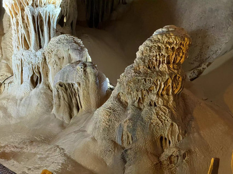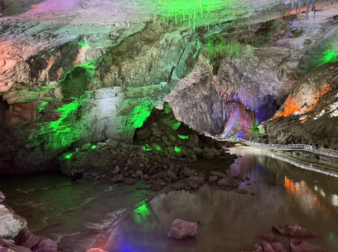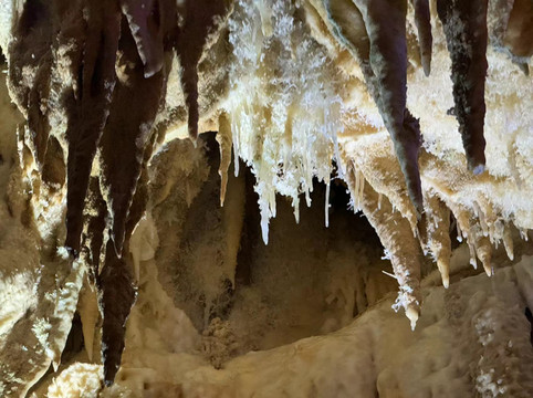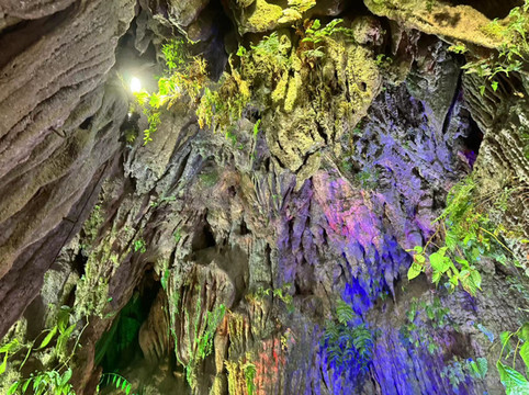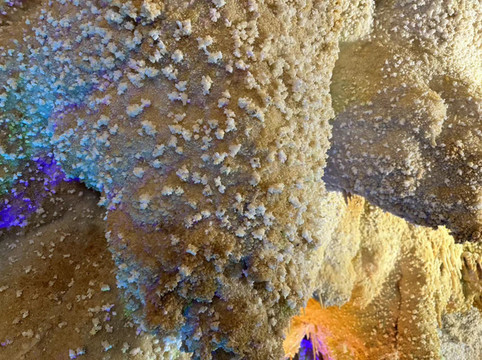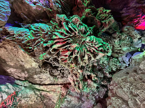 不过,水晶宫之所以得到赞誉,除了钟乳石外,还有几点原因。第一,洞中很多水晶,有的正在生长,有的埋在地下。水晶宫是2004年被当地人发现,立刻就被相关部门保护起来,否则里面的水晶估计早就被挖光了。第二,水晶宫和我们接下来要去的百魔洞,高地磁,高负氧离子的区域,在这种地方生活有助于身体健康。第三,水晶宫是唯一一个长有石花和石毛的地方。很多石头上长出细细的毛发,还有白色的小花。看起来像石头发了霉,摸上去这些毛发小花却坚硬无比。导游介绍完毕后返回入口继续接待下一批客人,我们则在这石洞中尽情呼吸着高负氧离子的空气。