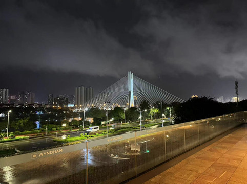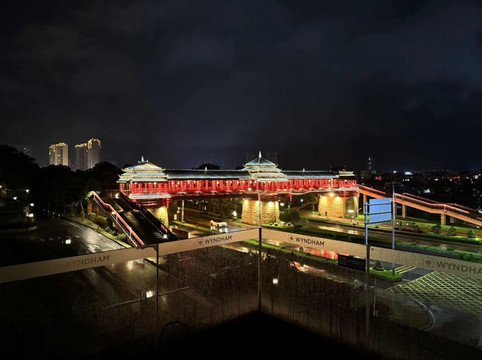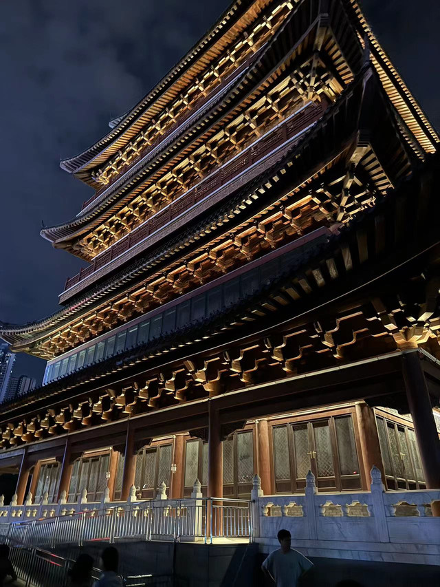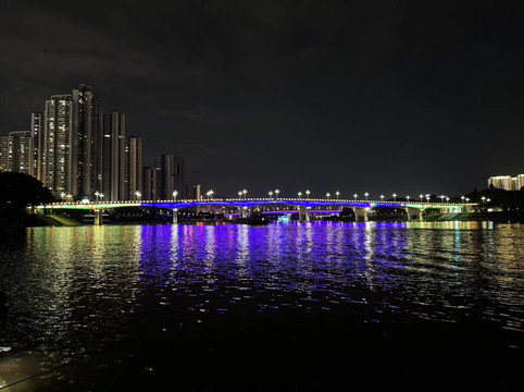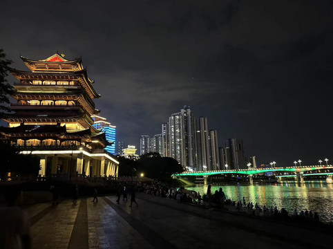 时间已晚,我们离开前去邕江打卡夜景。许多当地人在江边乘凉,有热恋中的情侣,有休闲的垂钓者,也有不少含饴弄孙的老者。旁边一座看似古色古香却又灯火辉煌的畅游阁,仿佛伴随着人们一起享受这慢节奏的生活。