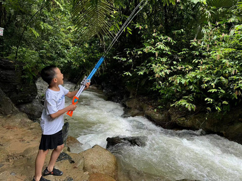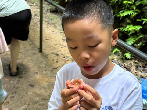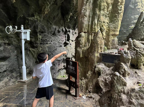 由于景点相对小众,加上最近天气不好,今天的游客很少,我们便可以自由自在的游览这几乎属于我们一家人的美景。进入峡谷时,我们首先会路过一片布满了许多原始植被的树林,以及有着许多历史故事的藏金洞和神掌断石。我们简单拍照便离开,只是滴水穿石引起了孩子的兴趣。在路边陪伴我们的有一条条小溪,从石缝中流出最终汇入峡谷中的河流。随后我们会穿过一个岩洞,沿着台阶下去,最终来到峡谷底部的河边。岩洞中的水在石缝中渗出,随机的滴在河边和台阶上观赏着石洞的游客们的身上,像下起了一阵阵凉爽的小雨。河边有很多当地人在售卖药材,例如三七,灵芝等等,也有人在出售野生的无花果。儿子一口气吃了四个,大呼好吃。更让他开心的则是,他的那把水枪终于在河边派上了用场,让他开心地浇灌着路边的树木和草丛。
