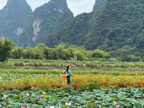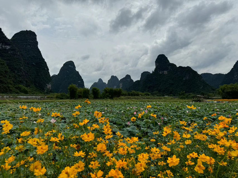 随后,我们骑车来到陇甘山水十里画廊,一看名字就是仿照桂林起的,但景色还是差了一点。简单打卡并吃完烧鸡后,下一站是骑车20分钟才能到达的那里酒店。这仅仅是个网红打卡地,因为这里有一片小小的金黄稻田。最后,我们来到那乙的一塘水池,距离公路不远。水中一片片无穷碧的接天莲叶和别样红的映日荷花,再加上路边盛开的小黄花,在远端起伏的群山环绕中,形成了一幅美丽的山水画。唯一的缺憾就是那略微阴暗的天气,但是,当骑着挎斗小电驴随着稻香河流继续奔跑,迎面而来的习习凉风真的让人感到非常舒服。