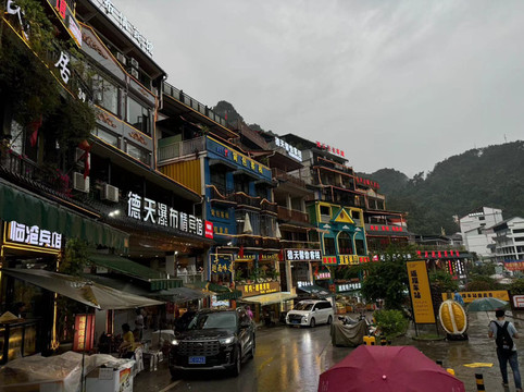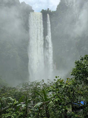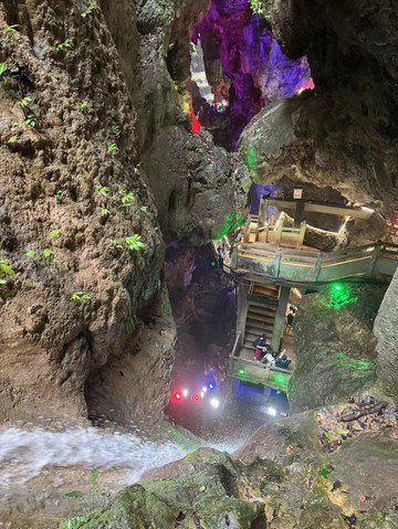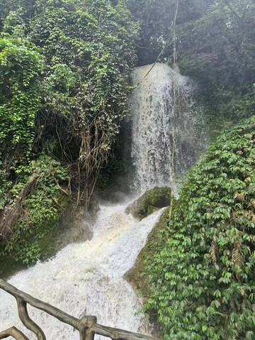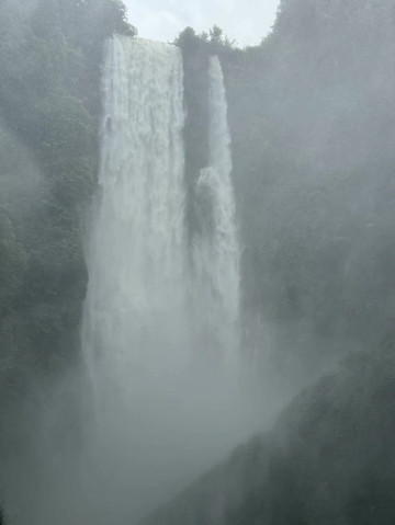 沿河前行,突然一道白练出现在远方,随即传来微微的震动声。这就是西南地区落差最大的通灵大瀑布。通灵大瀑布单体落差189米,超过了著名的庐山瀑布。远眺这从天而降的瀑布,我们得以置身感受飞流直下三千尺,疑是银河落九天。瀑布敲打着突出的岩石,溅起的水流随风微微摆动,宛如婀娜的少女的身姿,翩若惊鸿,宛若游龙。可是我们距离瀑布更近一些时,却有了一番别样的感受。刚刚被大雨喂饱了的大瀑布,除了从高到低纵向奔腾,还在努力的横向输出。因此即使距离瀑布百米之地,游客依然仿佛置身雨中。瀑布的气势让我手上的雨伞瞬间失效,只有身着雨衣的人们才能勉强避免湿身。通往瀑布后方水帘洞之路已经关闭,估计此时的洞中已经水流成河了吧。