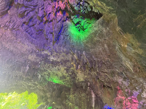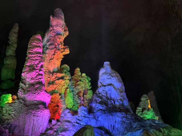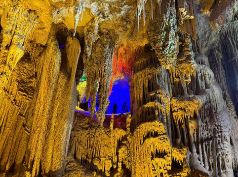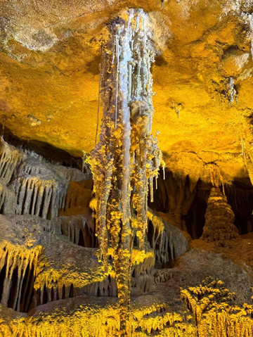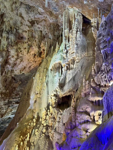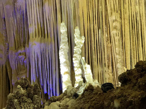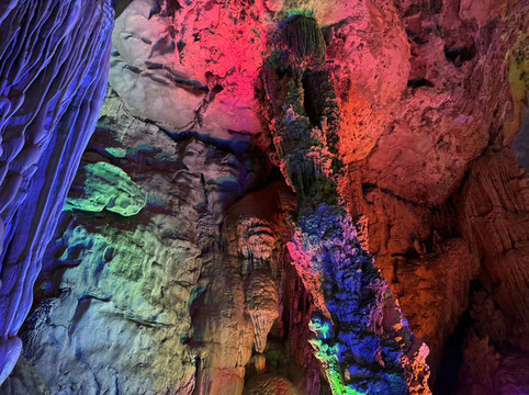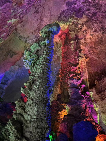 随后,我们来到第二个溶洞,这里就是钟乳石的世界。百魔洞与水晶宫有几分类似,却没有看到那些水晶柱,以及石毛和石花。尽管洞中的灯光一如既往的让这些石柱靓丽多彩,但缺少了导游的讲解,儿子顿时兴致全无,简单看了几眼就拉着妈妈出去了。只有我自己慢慢的走到溶洞深处,仔细欣赏这些钟乳石,享受着洞中的孤独和寂寞。是的,很孤独,因为快到了下班的时间,阴凉的大溶洞里一度就剩下我一个人陪着这些已经矗立万年的石柱。
