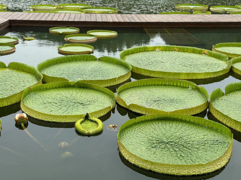 填饱了肚子,我们拉着依依不舍的儿子离开儿童乐园,走向不远处的莫奈花园。莫奈花园有花有草,郁郁葱葱,加上不太热的天气和刚刚停下的小雨,让这里变成一个散步的好去处。但是最让我们印象深刻的,是水生花园里那一片片的王莲。据说,王莲的叶子可以撑起一个小朋友。当然,没有人贸然让小朋友坐上去试试,但王莲的叶子摸起来倒是挺结实的。时间已经过去大半,而我们却只在青秀山磨蹭了不到四分之一的景区。于是我们赶紧来到小火车乘车处(青秀山内部很多景点都有小火车上下车的地方),准备从东门回到北门去看一下兰园和萌生植物园。一条小青蛇从等待小火车的队伍不远处快速游过,引来人们一阵惊叹。