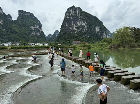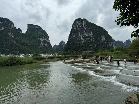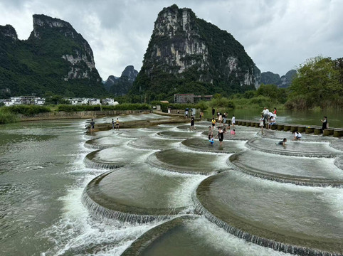加了租车大妈的微信,她把明仕田园的几个景点的地址发给了我。于是我们没有去看别人坐竹筏,而是开着挎斗沿着明仕田园转了一圈。第一站是鱼鳞坝,人们把浅浅的水坝修成鱼鳞状。清澈的河水沿着鱼鳞坝流下,在远处层峦叠嶂的山峰映衬下,别有一份风味。孩子们开心的在水里玩耍嬉戏,我们也忍不住给儿子买了把水枪,让他脱了鞋来到水中,与其他小朋友一起享受戏水的欢乐。此时已经过了午饭时间,我们在简单吃了点香肠雪糕后,在路边一位大哥那里买了只烤鸡。这竟然是我们在广西一周最丰盛的一顿午餐(除第一天在南宁的火锅外)。