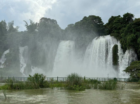 我们正心疼雪糕钱时,不远处出现了一个壮观的瀑布,远远望去有点黄果树瀑布的感觉。我知道德天瀑布到了,赶紧把雪糕几口吃完。复行数十步后我才发现,刚刚那个瀑布只是越南的小瀑布。当隶属中国的大瀑布展现在眼前时,才更加感受到德天大瀑布的震撼!(德天瀑布是亚洲最大的跨国瀑布,水量高达贵州黄果树瀑布的四倍。德天瀑布由两个瀑布组成,左边的瀑布偏小,隶属越南;右边的大瀑布隶属中国。)