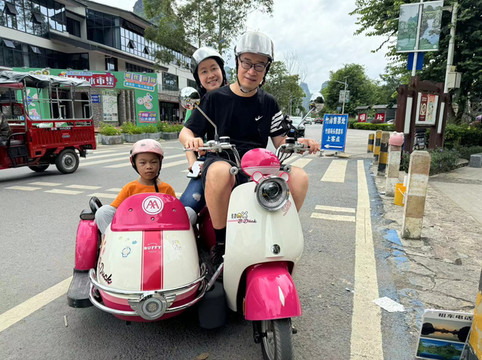 抵达明仕田园已经是中午时分,微微的阴天,给人一点点闷热的感觉。尽管明仕田园的卖点之一,是这里媲美桂林山水。尤其是坐在竹筏上漫游于河道之中,俨然一种身在桂林或者阳朔的感觉。可是,网上众多网友的攻略都不建议每人花100元去坐一段半个小时的竹筏。因为那段河道索然无味,真正漂亮的地方竹筏却到不了。于是我们果断放弃竹筏,在田园门口路边揽客的大妈那里租了一辆挎斗电动车。看到很多游客开着挎斗小车在马路上兜风,从来没骑过电动车和摩托车的我,也很自然的找了辆小车当上了司机。第一次开挎斗,我着实花了点时间适应了一下。一开始控制不好右手边的距离,坐挎斗里的儿子有几次差点被我给撞到马路牙子上。幸好我很快就找到了感觉,便开始带着全家享受挎斗小电驴的兜风之旅。