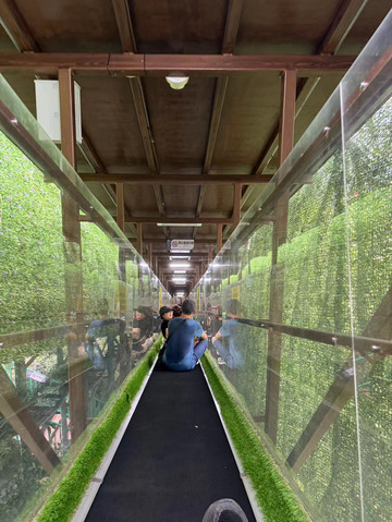 我们最后的计划是登山观瀑布。由于太太还在开会,我和儿子便买票上山。把游客带上山的设备叫做魔毯,说白了就是个传送机(跟机场运行李的传送带差不多),人坐在上面。传送带运行15分钟左右,把我们从山下运送到山顶。然而,正当我和儿子要感受一下会当凌绝顶,一览众山小时,天不作美,大雨突降。虽然我带了伞,但是我们的衣服和头发在之前观赏瀑布时,已经被水打湿,因此我们在雨中只是随意撑了一下伞而已。但是这场大雨却不大不小的影响了这里的景色,加上担心错过离开景区的大巴车,我们只是简单拍几张高空俯瞰德天瀑布的照片,便匆匆下山。上山坐魔毯,下山直接坐滑梯。一条长长的滑梯直通山下,每人可以领一条防滑裤(主要是保护自己的衣服)和一幅手套,坐滑梯时大人在前,孩子在后面。不用想,儿子自然是开心的,游乐场可没有这大滑梯。来到山下,与忙完工作的太太汇合后,我们便乘坐大巴车离开景区。