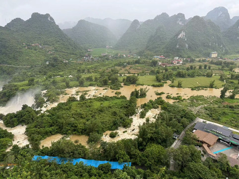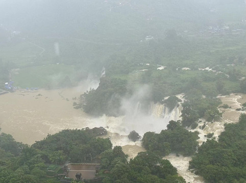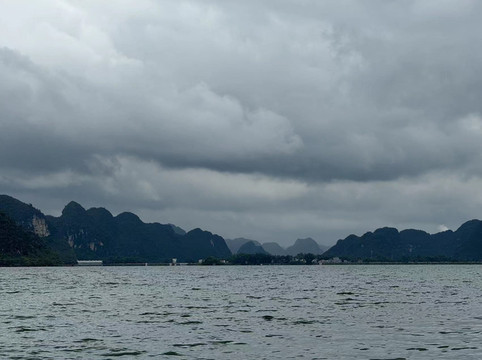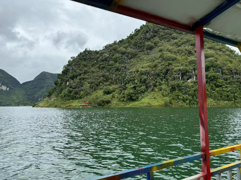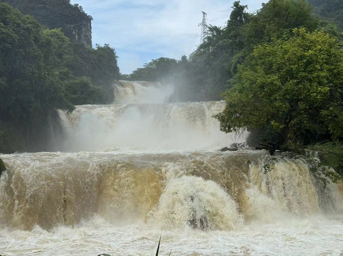 我们看的买家秀是这样的:一条昏黄的河水,一片浑浊的湖泊,以及青山上的片片乌云。停好车后,有个河边的船夫告诉我们说,由于连夜大雨,鹅泉中的多条道路已经被水淹没,无法通行,湖水和河水也因大雨而变得浑浊。他建议我们没必要买每人40多元的门票进入景区,而是可以乘他的船带我们到鹅泉周围转一圈,每人30元儿童免费。尽管我们知道船家的用意,但看看这黄乎乎的水,我们最终决定乘船前往。由于游客稀少,我们一家人包了他一艘船。据说鹅泉的泉水是德天瀑布之源,但这钟天气下我们也无法评估其水量是否真实。在船上,我们可以看到不远处的鹅泉,却无法靠近,因为前方有条被淹没的道路。但船夫也没骗我们,景区里面的游客的确无法前往,都只能远远的眺望一下,并想象鹅泉真正的样子。没办法,旅游就是要看天气,老天不赏脸就会把美景收走。