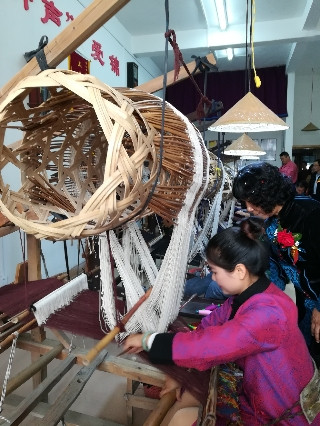 这种竹笼织布机早在宋代就有了,现在广西宾阳还用来织壮锦