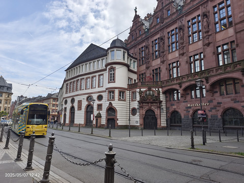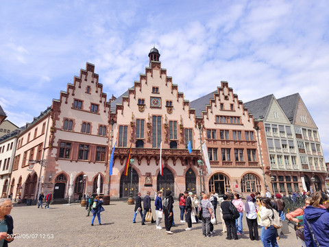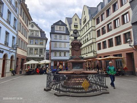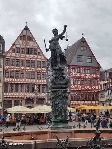 罗马广场是法兰克福的中心,中世纪风格,广场中心是正义女神喷泉,旁边是市政厅。正义女神为铜雕像,面向市政厅,右手持剑,象征法律的威严,左手持天平,象征公平公正,喷泉水代替了曾经举办重要仪式时喷出的葡萄酒。