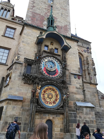 开卡模式开启:天文钟(捷克语:Pra?skýorloj)位于老城市政厅的哥特式钟塔上,属于捷克哥特式科学和技术的登峰造极之作以及豪华壮观的艺术古迹。分为上下二座,是一座精美别致的自鸣钟,根据当年的地球中心说原理设计,上面的钟一年绕一周,下面的一天绕一圈。每逢正点都会有骷髅拉动时间、圣徒现身、雄鸡鸣叫等各种报时。每天中午12点,十二尊耶酥门徒从钟旁依次现身,6个向左转,6个向右转,随着雄鸡的一声鸣叫,窗子关闭,报时钟声响起。