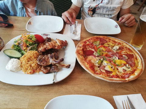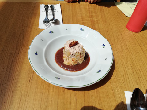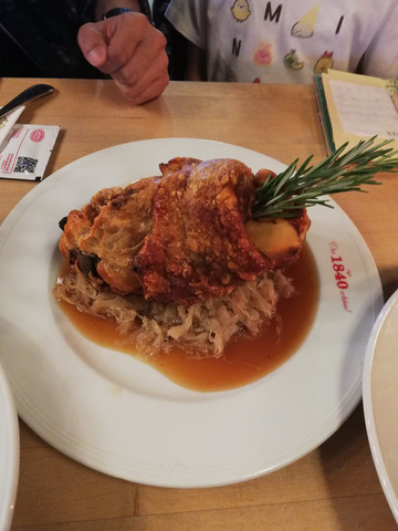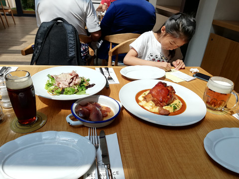 德国猪肘加啤酒标配,这个肘子在2017年来德国时吃过,真心吃不惯,以为换了不同的城市会好一些,结果还是一样。表皮很硬,不如捷克的好吃。当然也没有祖国的好吃。