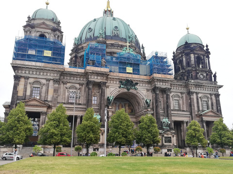 柏林大教堂建于1894年-1905年,曾经作为王室的专用教堂,内饰极其华丽,它的室内金碧辉煌,装饰着线条复杂的柱子和精美的壁画,甚至柱头都是镀金的,地上建筑有4层,最高处高达114米。忘记什么原因了,我们去的当天不允许参观,只允许做礼拜的人进入。