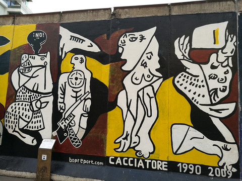 柏林墙是冷战期间民主德国政府环绕西柏林边境修筑的全封闭边防系统,是二战后德国分裂和冷战的重要标志性建筑。1989年11月开放柏林墙的消息被宣布后,数以万计的市民走上街头,拆除围墙,整个德国陷入极度兴奋状态。之后随着两德的统一,柏林墙被拆除,一小部分被保留了下来,东边画廊就是其中最长的一段。