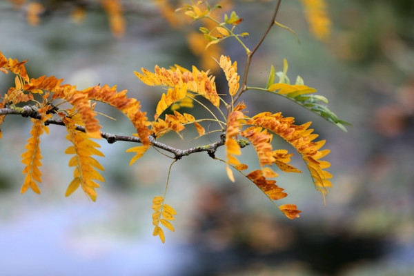 池塘上建了一座小桥,叫做“日本桥”。它也是绿色的,与落水的柳树融为一体。站在桥上,看着池塘里已经残缺的睡莲,静静地躺在绿色的大“床”上,旁边的树上叶子已经泛黄。