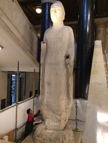 这尊佛像高大、漂亮,它面容俊秀,双目微启,笑意盈盈。身上的袈裟线条简洁流畅,宛若轻纱。整个雕像高约5.8米,几乎相当于两层楼的高度,由于太过高大,只能陈列在这楼梯的空隙之处。您知道它所处的时代更会惊讶,它雕刻于隋朝开皇5年,公元585年,当时立于今天 河北 的崇光寺,距今将近1500年的历史了。