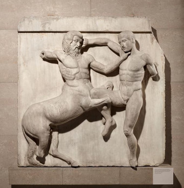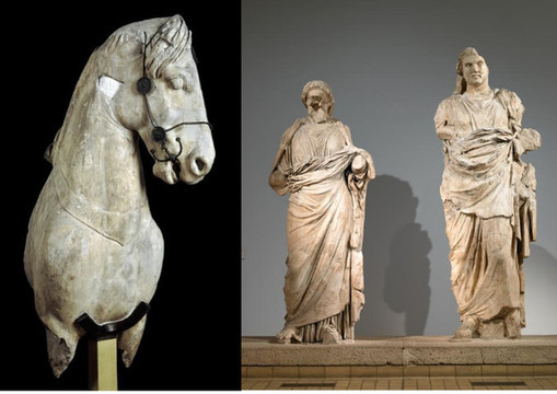 大英 博物馆展出的这些古典 希腊 雕塑最初是帕台农神庙的一部分。帕台农神庙是 希腊 一座有2500年历史的供奉 希腊 女神 雅典 娜的神庙。它们是1801年由 埃尔金 勋爵带到 英国 的,是让我们了解古 希腊 生活的一些最重要的考古发现。神庙装饰有大量精美的 大理 石雕像,也是由菲狄亚斯(Pheidias)设计并监督完成的。排档间饰(Metope)及三角楣饰(pediment)的雕像取材古 希腊 神话,包括了著名的月亮神塞勒涅的马头雕像, 伊利 索斯河神像以及半人马和拉皮斯之战高浮雕。腰线(frieze)处的装饰则主要表现了 雅典 人民的宗教信仰。