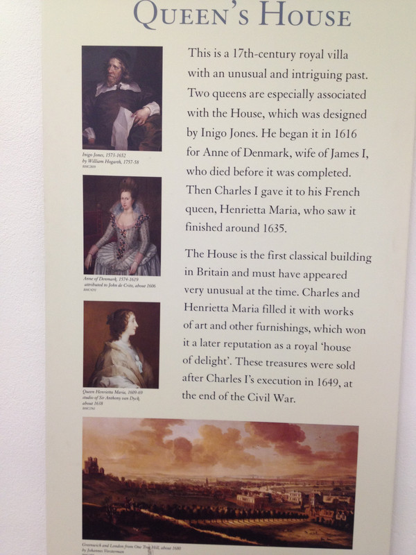 格林威治王后宫,俗称女王宫,位于海事博物馆傍边的一栋白色建筑。是由詹姆斯一世(1603–25在位)的王后安妮(丹麦弗雷德里克二世的女儿)下令建造的。于1635年建成完工。后来成为查理一世和玛丽亚皇后的住所,也由于玛丽亚皇后非常喜爱这个宅第,因此逐渐形成皇后之屋的称呼。这是著名宫廷建筑师伊尼戈·琼斯设计,是英格兰第一个全古典式建筑。反映了文艺复兴时期的数学理念、古典均衡与合谐。该宫殿现在是博物馆的一部分,里面陈列着一些纯艺术的收藏品。也是免费参观。