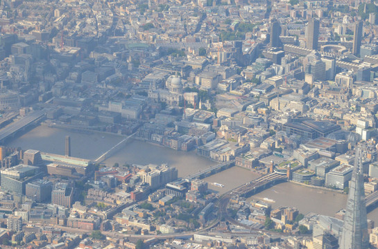 图 河畔地区鸟瞰。右下见碎片大厦,圣保罗大教堂居中(绿色穹顶),它经千禧桥(Millennium Bridge)直通泰特现代美术馆(黑色烟囱、绿色玻璃屋顶)。从右至左依次可见 1.伦敦桥, 2.坎农街铁路桥,3.萨瑟克桥,4.千禧桥,5. 黑衣修士桥(Blackfrtas Bridge)。