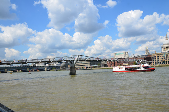 图 2000年建成的千禧桥直达河北岸的圣保罗大教堂,方便了两岸游客。为不妨碍观赏风景,当代建筑大师诺曼·福斯特摒弃了吊塔吊索的常规方案,将这座吊桥设计成现今简洁清朗的模样。不过好事多磨,刚开放三天就因桥身摇晃而封闭,经整修后到2002年才恢复通行。远处为黑衣修士桥。