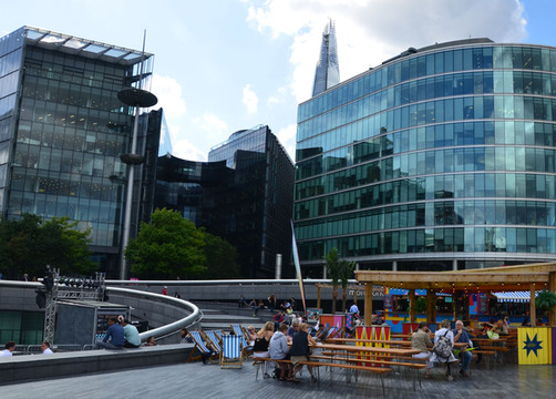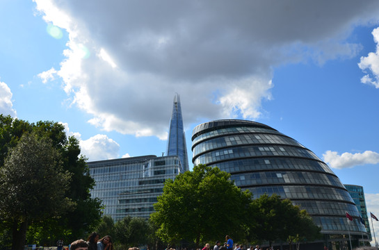 图 河畔风光:2002年落成的椭圆形伦敦市政厅与2013年建成的碎片大厦尖顶相映成趣。登碎片大厦观景约需30英镑,而市政厅一楼大厅和顶层对公众开放,被昵称为 “伦敦客厅”。