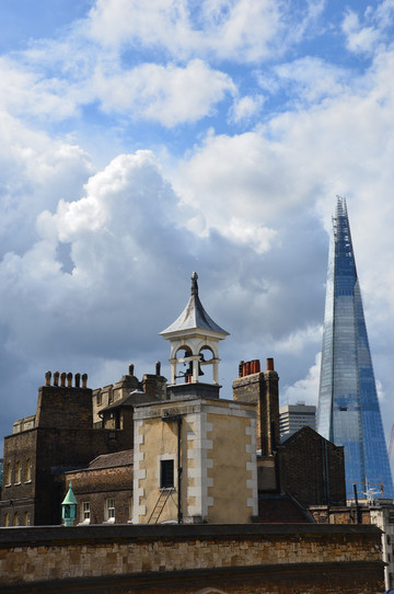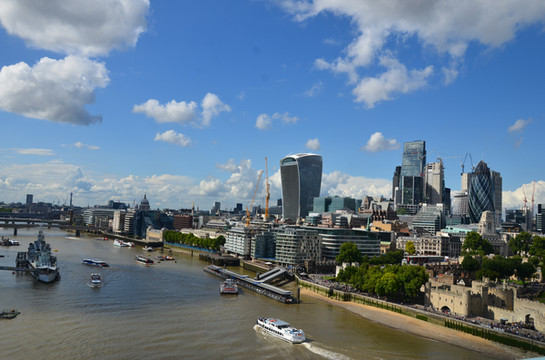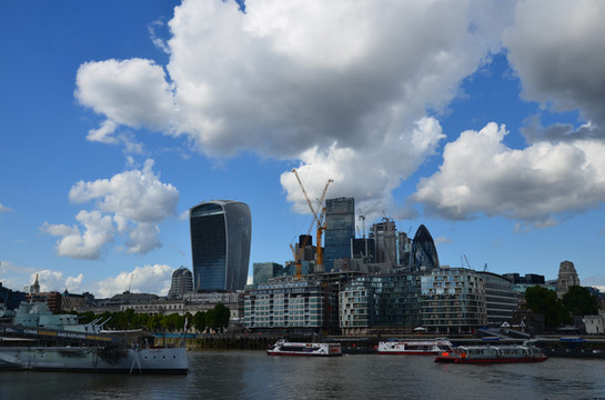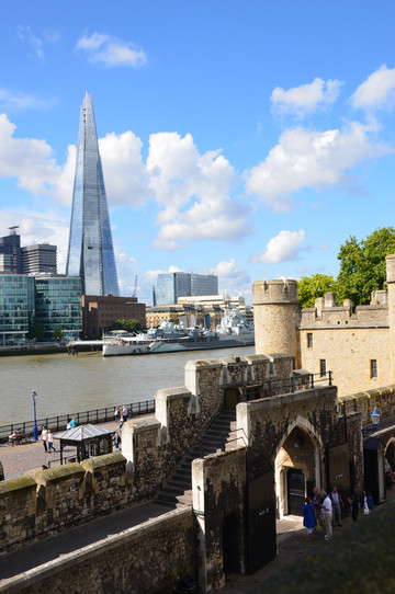 图 从伦敦塔远眺泰晤士河:尖塔为新地标碎片大厦,河中停泊着贝尔法斯特号巡洋舰。