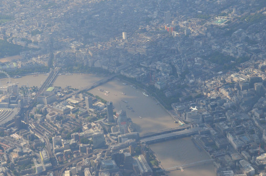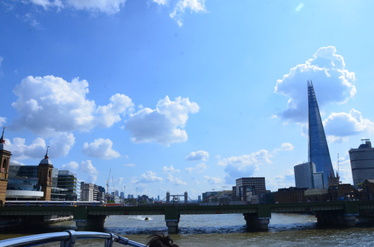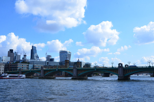 图 从上游回望碎片大厦。近处是坎农街铁路桥(Cannon Street Railway Bridge ),远处依稀可见伦敦桥及上面行驶的公交车,再远可见伦敦塔桥。