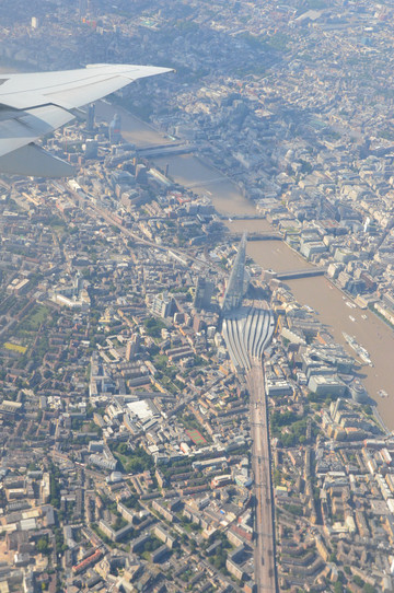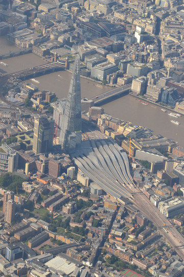 图 伦敦的河畔(Sidebank)地区鸟瞰。河中大船为旅游热点贝尔法斯特号巡洋舰(HMS Belfast),旁边绿色建筑为新市政厅等,其下方依稀可见伦敦塔桥南端支撑梁。图中最显著的是呈尖刺状的碎片大厦(The Shard)和伦敦桥火车站。