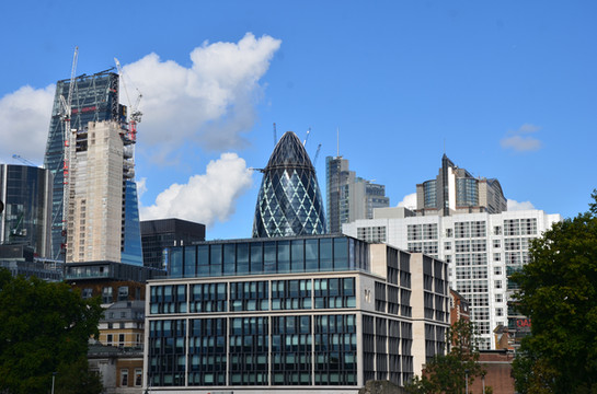 图 泰晤士河北岸摩天大楼争奇斗艳。左边一峰独秀的是 Fenchurch 街 20 号 “空中花园”;中间最高者为 Leadenhall 街 122 号,昵称为 “奶酪刨”(Cheesegrater);右边圆锥形建筑是著名的 “小黄瓜”(Gherkin ),正式名称是圣玛丽斧街 30 号,或称瑞士再保险总公司大厦。最右边的塔山纪念碑则似乎被冷落一旁。