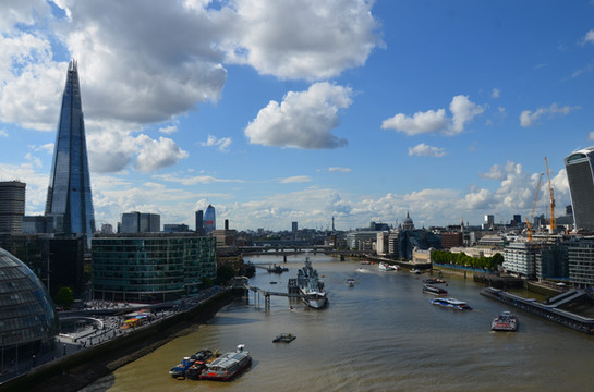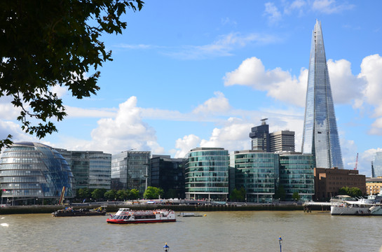 图 河畔风光:碎片大厦如擎天玉柱,左侧可见椭圆形的伦敦市政厅,右下方停泊着贝尔法斯特号巡洋舰,河中行驶着城市巡游公司(City Cruises)的红色游船。