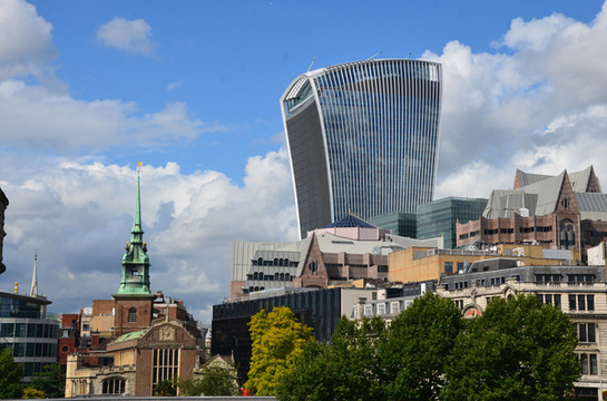 图 在伦敦塔桥上极目骋望,形状迥异的现代化建筑南北呼应,南岸是尖锋般的碎片大厦和圆形的市政厅,北岸是厚实的 “空中花园” 大厦。