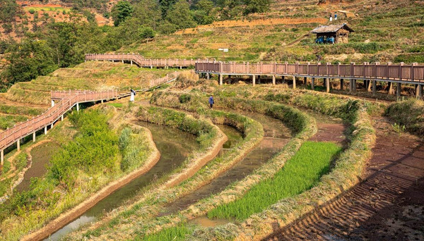 我们要去的下一个景点就是米易的新山梯田以及龙肘山杜鹃景区,那里属于傈僳族居住地,从物茂土林到米易新山梯田有二百公里左右,基本是全高速,下高速有一段县道,路况还是很不错,全程三个小时左右,从下高速到景区是一路爬山,四点过我们到达新山梯田,因为太阳还高挂离傍晚还早,还不适合照相,于是就在附近走走看看。这里因为温度太高,水对当地来说确实太珍贵了,好多梯田里已没水了,已变成了经济作物种植,满山种了很多枇杷、芒果,有水的梯田都修了栈道让游客步行游玩(一会看图)。农家乐还是有一些,但入住的很少,一些农家乐的房前屋后都种植了很多水果,还有桑椹树,桑椹树已经结果了,我们还有另外一行人都在树下讨摘,太甜了,像吃蜜糖一样。我们向当地老乡了解龙肘山的情况,结果告诉我们由于天气干燥,龙肘山已经封山禁止进山旅游了。看来杜鹃是看不成了。