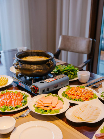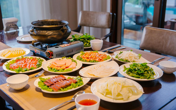 从泳池里上来,天色渐暗,寒气渐凉,酒店管家便贴心的给大家准备了云南特色的土鸡腊肉火锅,涮各种喜欢素菜荤菜,聊着家常,竟有些不舍起来。