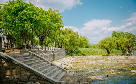 听说环洱海一段很多地方都在修路不能进去,心心念念的海舌公园同样也不例外,随行的管家便推荐了一条古生村的路线(这时候觉得有个当地的导游真好)。古生村里民居古朴,街巷整洁,溪水环绕,绿树成荫,绕着村子小走一段路便可以直通洱海边,虽说是枯水期,但大理的洱海依旧美成了画。