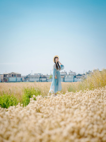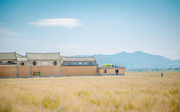 还未进城,面前便是一大片油菜花田,听说3月底的时候开满了金灿灿的油菜花,搭配上大理的治愈系天空美成了仙境,虽说现在花期已过,暗黄的色调看着稍微有些荒芜,却让这里多了一份静谧的美。