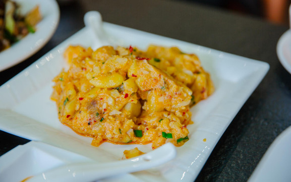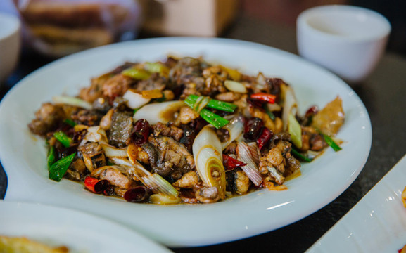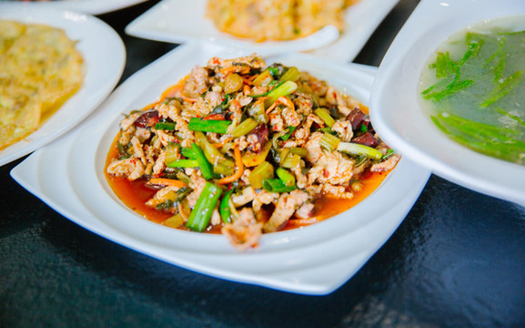 品尝完了小吃,眼看着已近中午,便打卡了古镇里的一家翰林院餐厅,这也是一家白族的古建筑体验店,老奶洋芋、黄焖鸡、酸菜炒肉、酸辣鱼等招牌菜一一上桌,色香味俱全,让人赞不绝口。