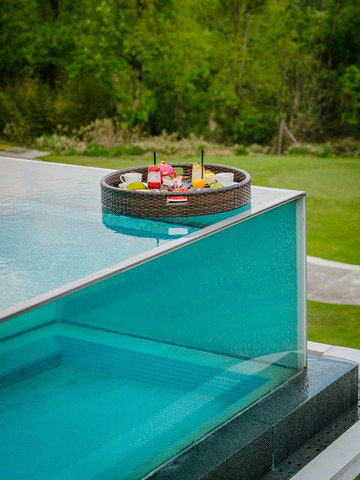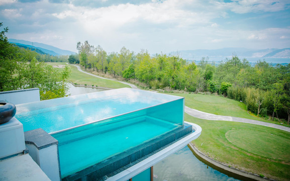 餐厅外的风景,依旧是酒店里最吸引大家的地方,置身于中国最美的高尔夫球场里,一座网红半悬空式无边泳池映入眼帘,透过玻璃泳池,能俯瞰整个高尔夫球场,似乎随手一拍就都是大片即视感!