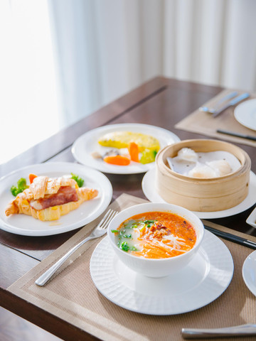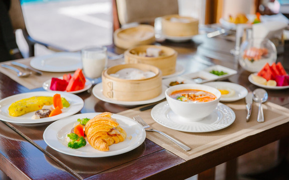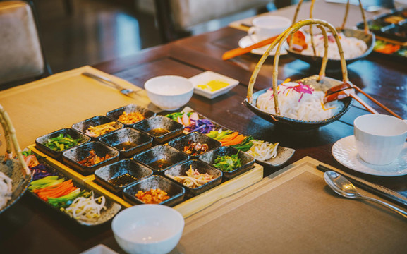 酒店只有一个餐厅,可以选择中西式菜式,初来云南,还是想吃点当地的特色,便跟管家点了份云南米线,上桌的时候摆了满满一桌的佐料格外的精致。