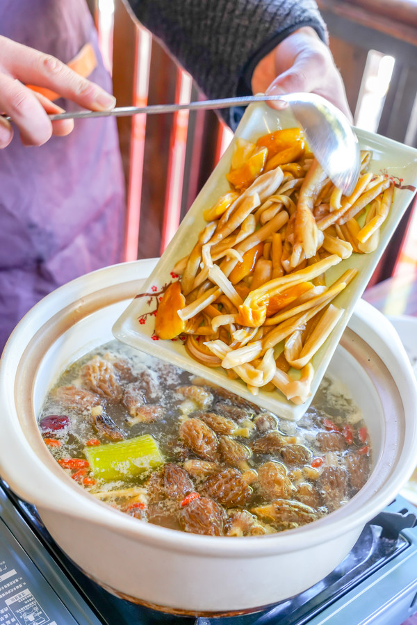 来吧,一锅又浓又香的菌汤好了,乘上一碗汤,享受大理超赞的美食吧。