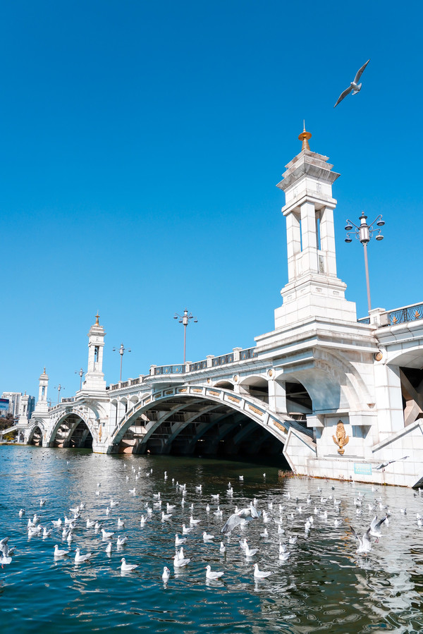 桥边有很多的海鸥,还有很多黑色的野鸭子,桥的造型很欧式,恍惚间像是在欧洲?