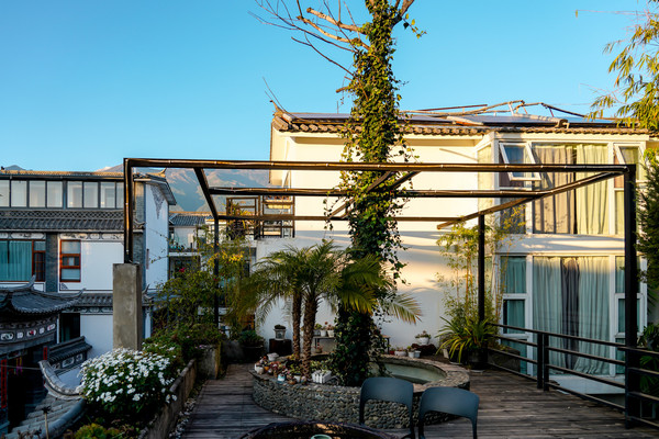 客栈一共有三层,二层和楼顶各有一个平台,很适合三五好友坐下来聊聊天,楼顶还可以远眺苍山,视野很开阔,景色很美。