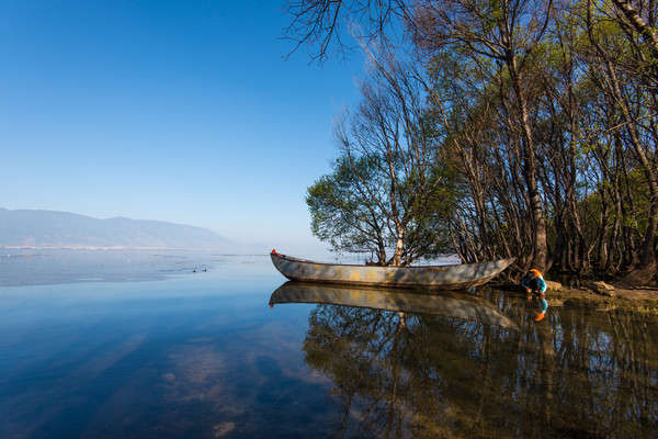 一边靠洱海,蓝天、白云、树林、湿地、渔船……各种元素绘成一幅绝美的山水风光,让人流连忘返。