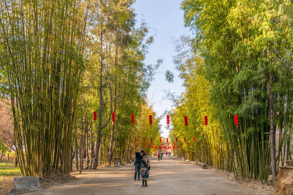 走进公园大门,最先映入眼帘的是两排郁郁葱葱的竹林,绿的沁人心脾,阳光透过竹林缝隙洒在路上和对面的竹林上,映射出点点黄色光芒。