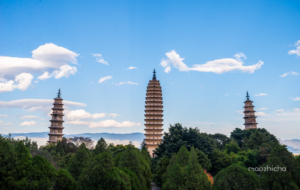 崇圣寺三塔始建于南诏王劝丰祐时期(公元824—859年),先建了大塔“千寻塔”,高69.13米,是一座座方形密檐式砖塔,共16层。而后又建了南、北小塔,均高42.19米,是一对八角形的砖塔,都是10级。修建三塔,除了佛家所宣扬的可以成佛外,还有一个重要的原因,是大理古为“泽国多水患”,而塔有镇水的作用。