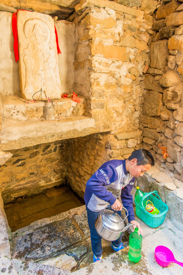 在村里闲逛时,碰到了三个小朋友,得知他们要去观音井打水,就兴趣盎然的跟着他们一起来了。观音井在路旁一个非常不明显的石梯下面,一个不算太大的长方形井口,进口上方有一座观音石像,故名“观音井”,村民饮水都从这里取用,井水没有被污染,可以直接饮用,小妹妹渴得一到井边就先咕噜咕噜豪饮的半勺。