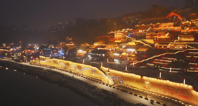 整座古镇依山而建,沿江而立,用分层筑台,吊脚,层叠等手法创造了一个非常有立体感和层次感的建筑群,航拍视角非常出彩。