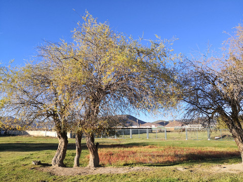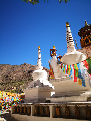 先路过白塔公园,大门是关闭的,下午返程时,再次路过,看到门上有纸条写着“开门拉线”,原来是可以进入,但要随手关门。白塔公园中有 119 个小塔环绕主塔,形成了别具一格的塔林,这 119 个小塔分别代表全县 119 个村子。主塔高 33 米,小塔高 2.5 米,还有大转经筒,在蓝天的映衬之下,气势雄伟。