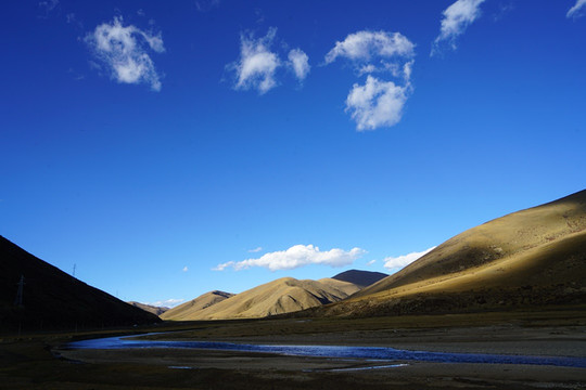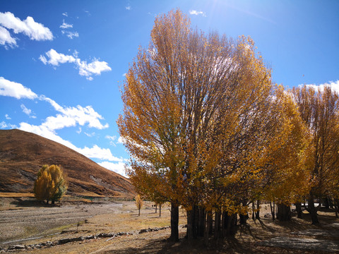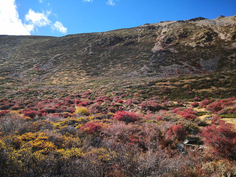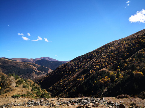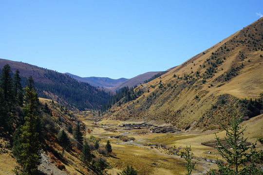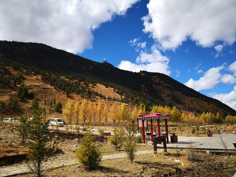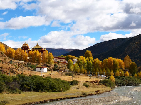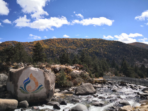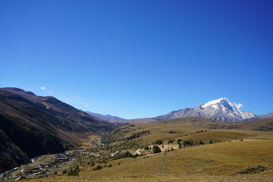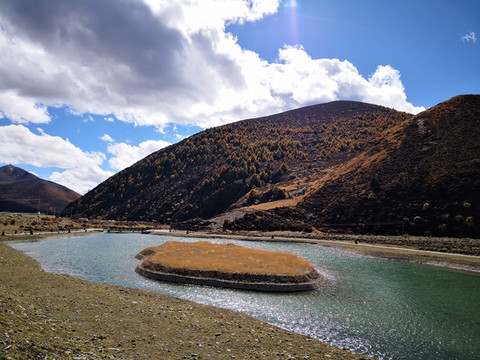 秋季的格聂,纯净的天空、金黄的草、碧绿的水、满坡的彩林,是一片大型风景区。