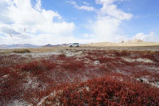 从香日满转入德马高速后,眼前一大片湖水,还看到了那一片标志性的红草滩,那就是冬给措纳湖,整个湖边几乎没有游客,湖面安静。湖边的红水草是矮矮的一种不起眼的小草,红得那么艳,好似地面上铺了一张绣花地毯。